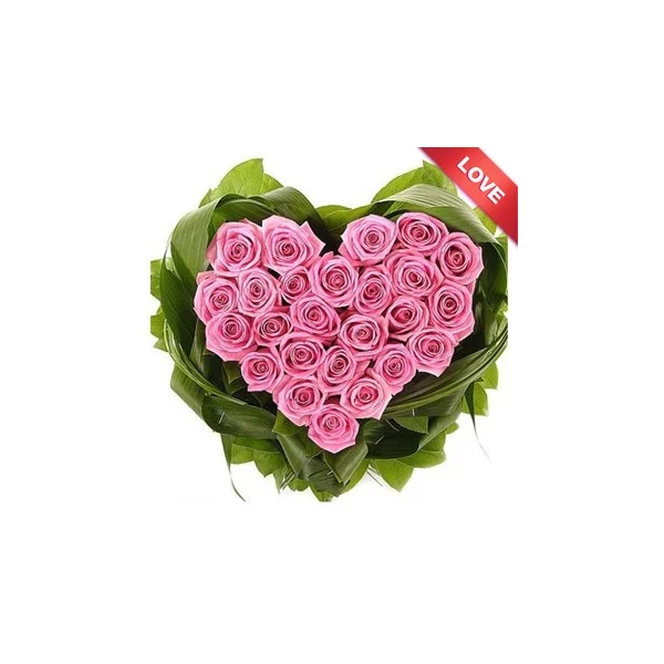 Люкс: роза розовая - 25 шт, декоративная зелень, оазис сердце.