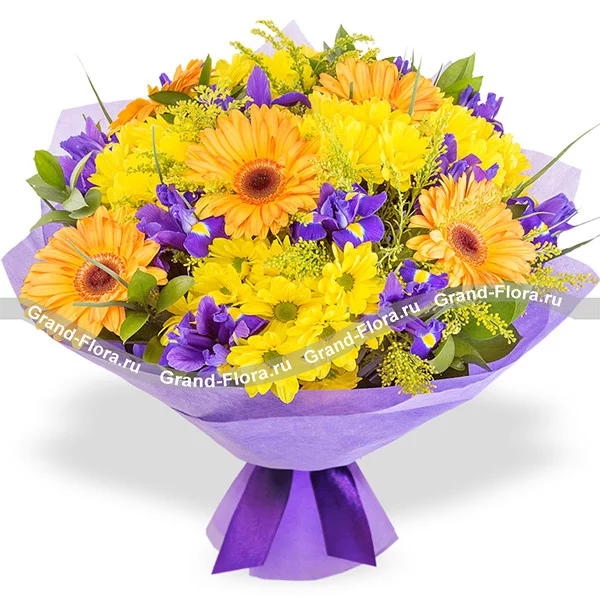 Стандартный (на фото): гербера оранжевая - 5 шт., ирисы - 10 шт., хризантема желтая кустовая ромашковая - 4 шт., декоративная зелень., упаковка, лента.