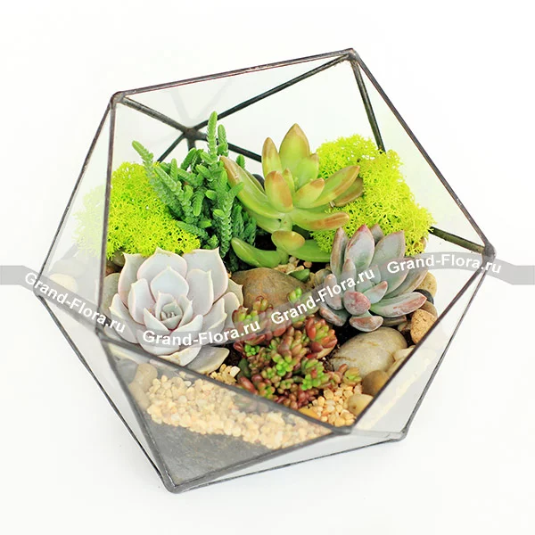 "Икосаэдр мини" - это небольшой флорариум с яркими суккулентами в вазе ручной работы. Очень гармоничная композиция, которая потребует минимального ухода. А весной, в период цветения суккулентов, от него просто невозможно оторвать взгляд!