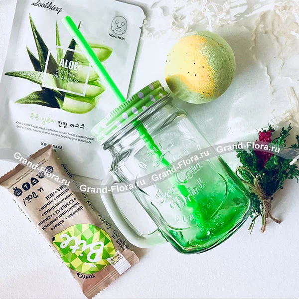 Стандартный: баночка-кружка с крышкой и соломинкой - 1 шт., тканевая маска для лица с экстрактом алоэ - 1 шт., бомбочка для ванны «Цитрус» - 1 шт., полезный батончик из злаков, орехов и фруктов - - 1 шт., подарочная коробка, декор из сухоцветов.