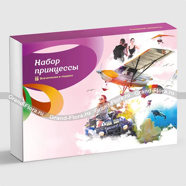 В подарочный набор входит сертификат на одно из впечатлений на выбор: аквапарк, полет на самолете, фотосессия, дайвинг, дегустация вин и т.д.