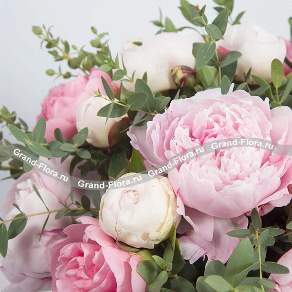 Стандартный: пион розовый - 8 шт., пион белый - 7 шт., декоративная зелень, оазис, коробка.