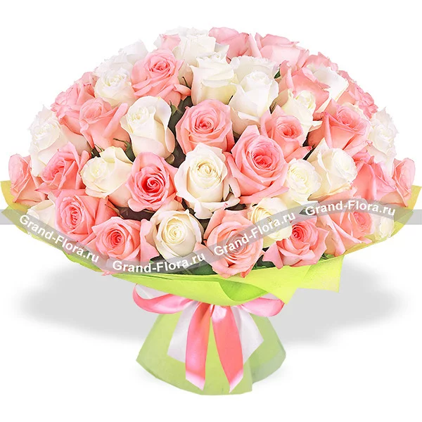 Классический вариант букета для подарка дорогому человеку или на долгожданное торжество. Нежно – розовые и белые розы, символизирующие искренность и чистоту намерений. Воплощение стиля, изысканной элегантности и дорогой простоты.